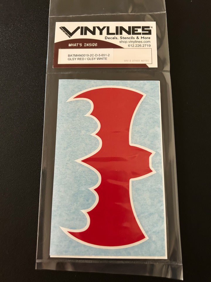 5 inch glossy red on glossy white 1966 Batmobile symbol decal 2 pack.