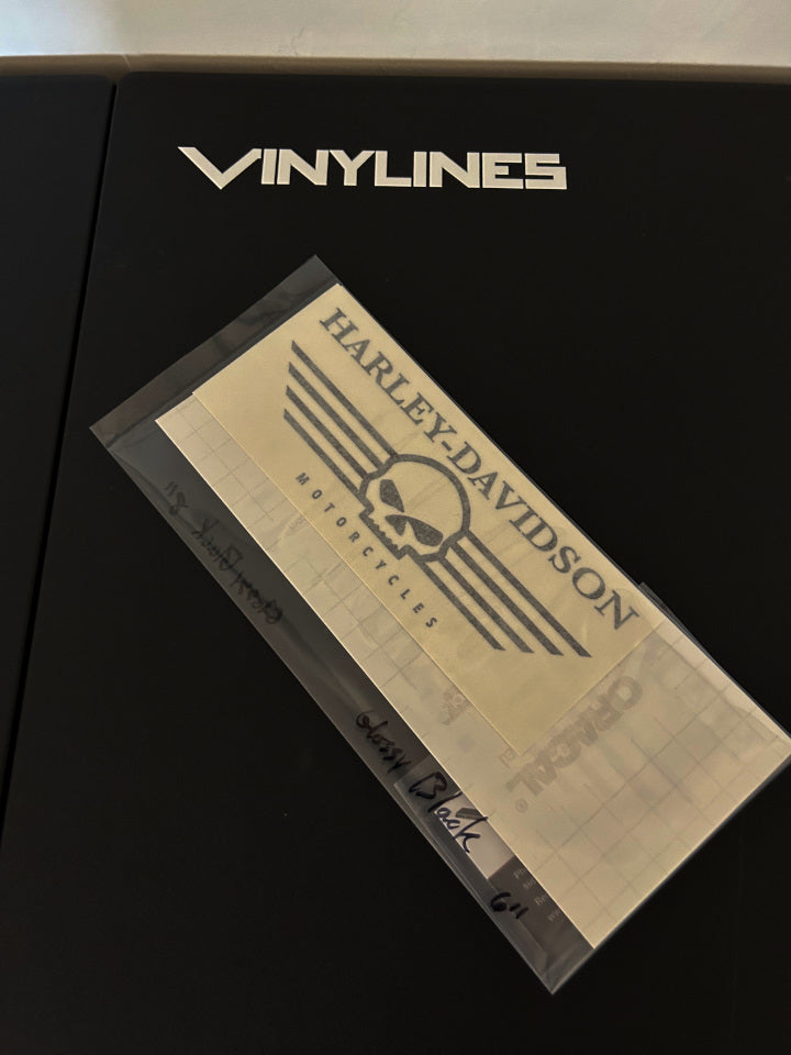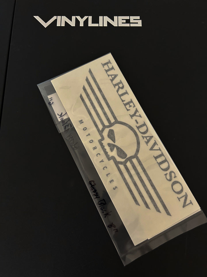 You get one 6in and one 8in glossy black Harley-Davidson WIllie G skull with lines decal pack.